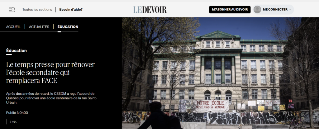 Le gouvernement québécois a décidé de vendre le bâtiment patrimonial de l’école FACE, jugeant le prix des rénovations trop élevé. Les élèves du primaire et ceux du secondaire seront séparés de façon permanente dans différents bâtiments sans aucune infrastructure nécessaire à la réalisation de son programme pédagogique unique au Québec.